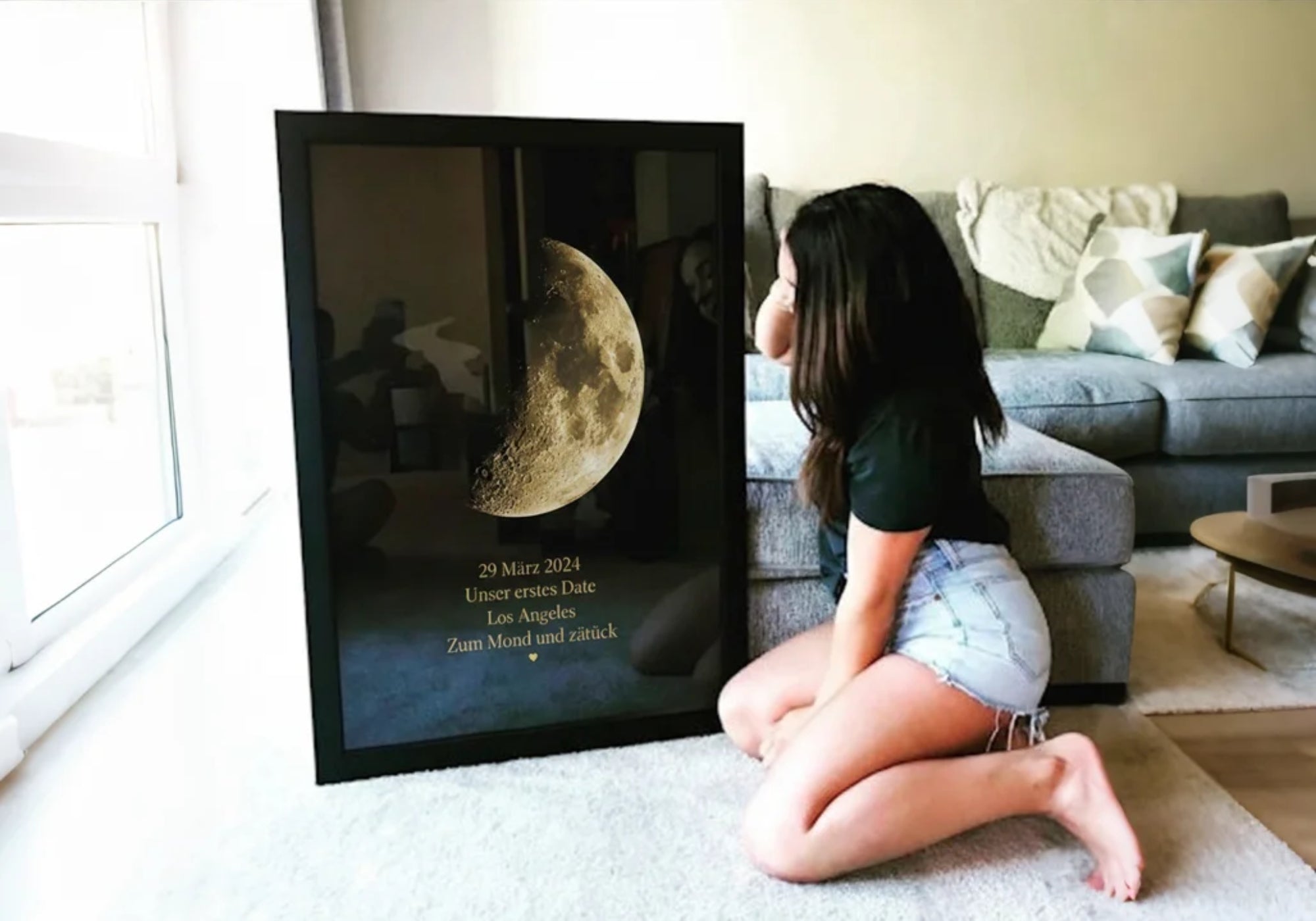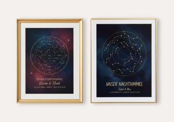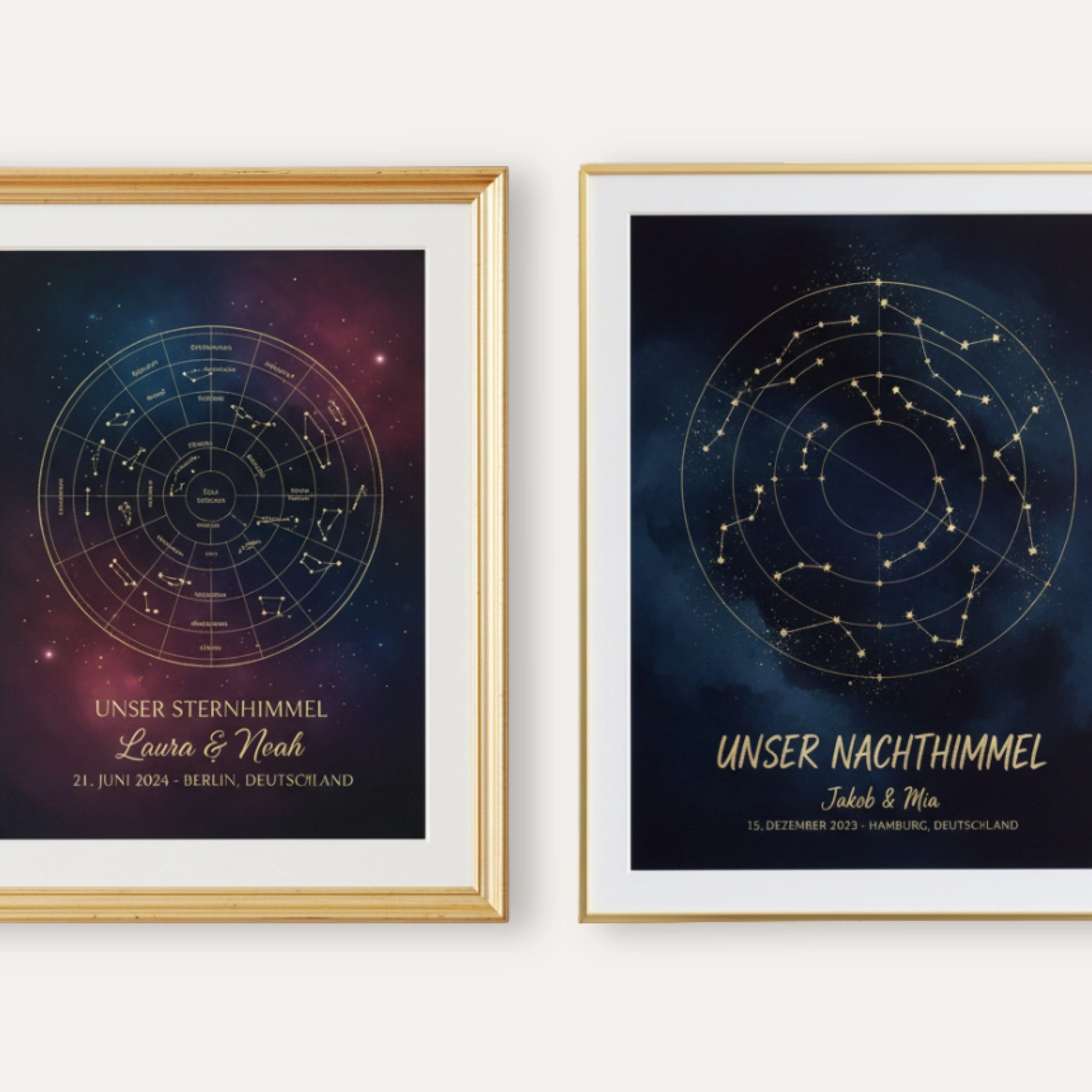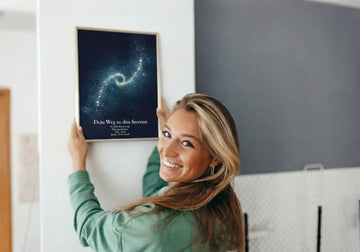 Eine personalisierte Sternenkarte zeigt den Himmel an einem besonderen Datum und Ort, z.B. für Geburtstage oder Jubiläen, und lässt sich individuell anpassen.