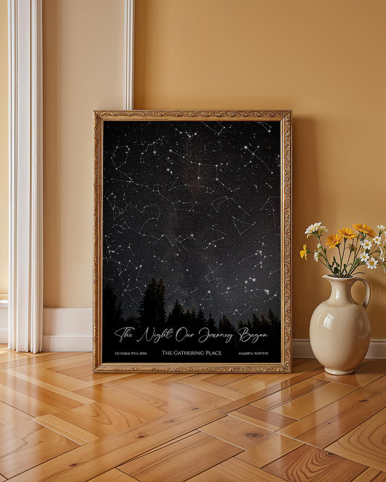 Wählen Sie Ihr Datum und Ihren Ort, und entdecken Sie, wie sich die Sterne in dieser unvergesslichen Nacht ausgerichtet haben – ein zeitloses Andenken für jede Geschichte.